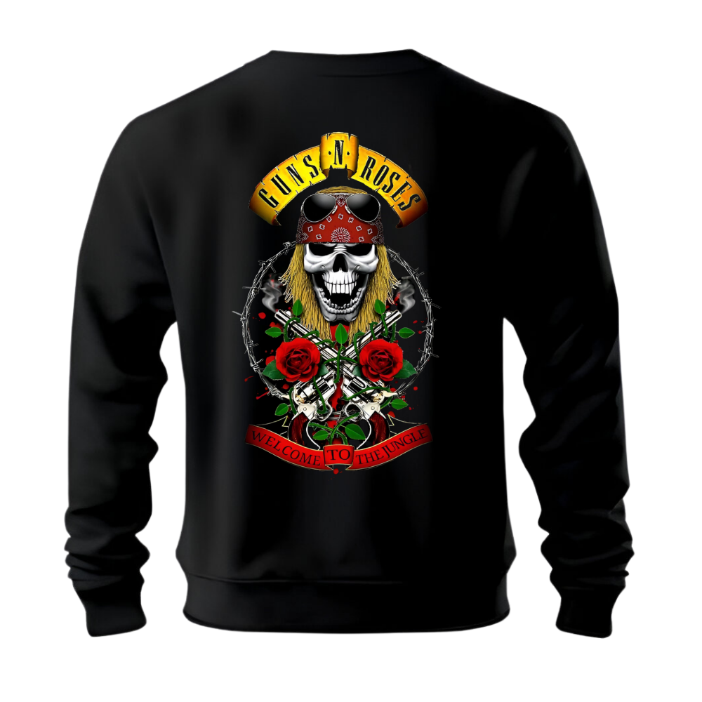 Dale estilo a tu outfit con este increíble buzo negro inspirado en una de las bandas de rock más icónicas de todos los tiempos. Con estampado en la parte trasera de calavera, rosas y el clásico logo Guns N’ Roses, es perfecto para fanáticos del rock y la moda urbana.